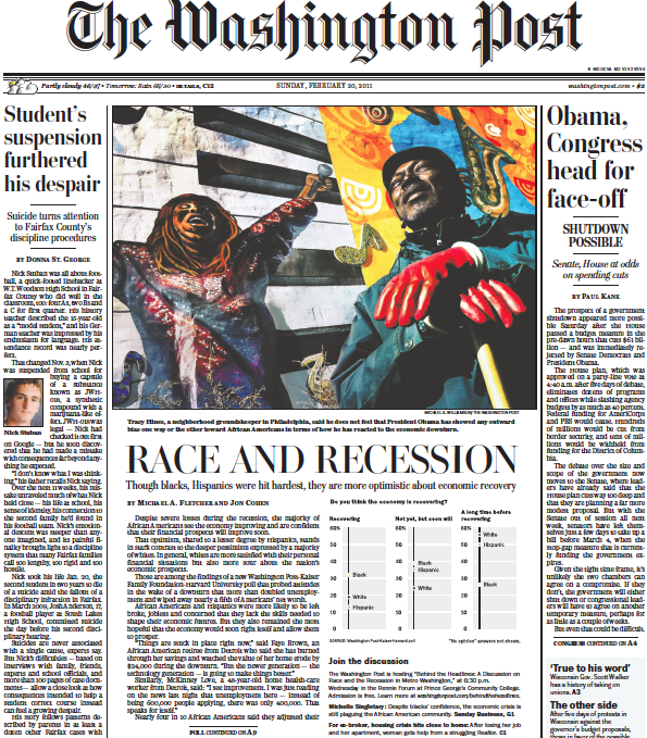 In a Feb. 24 column on FoxNews.com, Juan Williams rebuked the Washington Post for downplaying a poll measuring the views of blacks and Latinos on the recession. The poll, which the Post itself helped produce, showed those groups were more optimistic than whites about the U.S. economy despite being hit harder in the downturn. According to Williams, the Post’s poll coverage “did not make its front page” but instead was “buried” in the business section. This was typical, Williams said, of “big media’s inability to report on good news when it comes to life among people of color.”