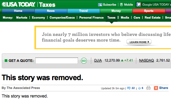 Many people quickly took notice of USA Today’s publication of the story, including the pranksters themselves. But later on Wednesday if you clicked on the link to that story, you arrived on a USA Today page simply telling you that it had been removed: