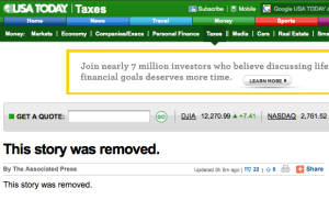 If the AP’s blunder had been headed for USA Today’s print pages, it would have been caught and not published — but even in the unlikely event that it had been published, you can be sure the paper would have run a correction notice in a subsequent edition. Online publishing makes it easier to cause embarrassing errors to disappear, but it doesn’t remove any of a publisher’s responsibility to own up to and correct them.