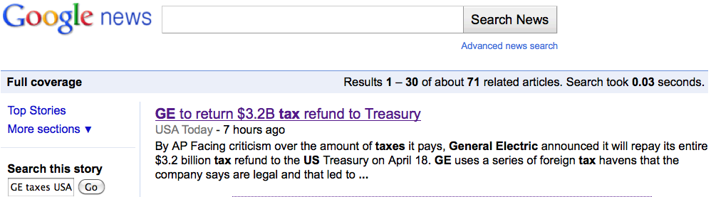 If you searched for the bogus GE tax story on Google News on Wednesday, you would have seen that USA Today ran with it: