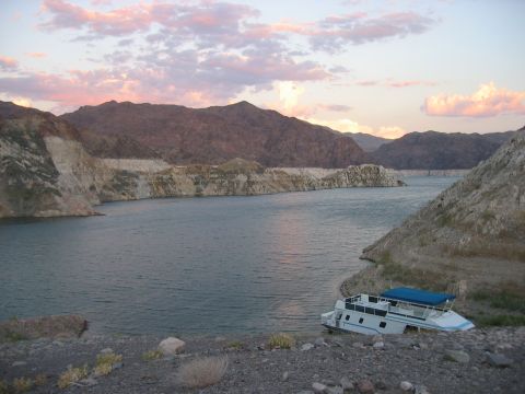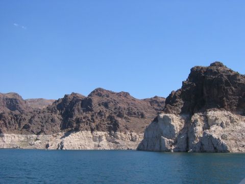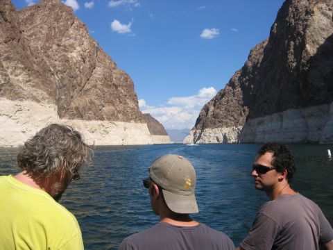 Statistics can be elusive. One of the best ways to realize the change is from directly on the lake itself. Last August I took a houseboat trip with some friends on Lake Mead, where I snapped some photos showing the drop in the water line. The lake is enormous — but so is the space no longer filled with water: